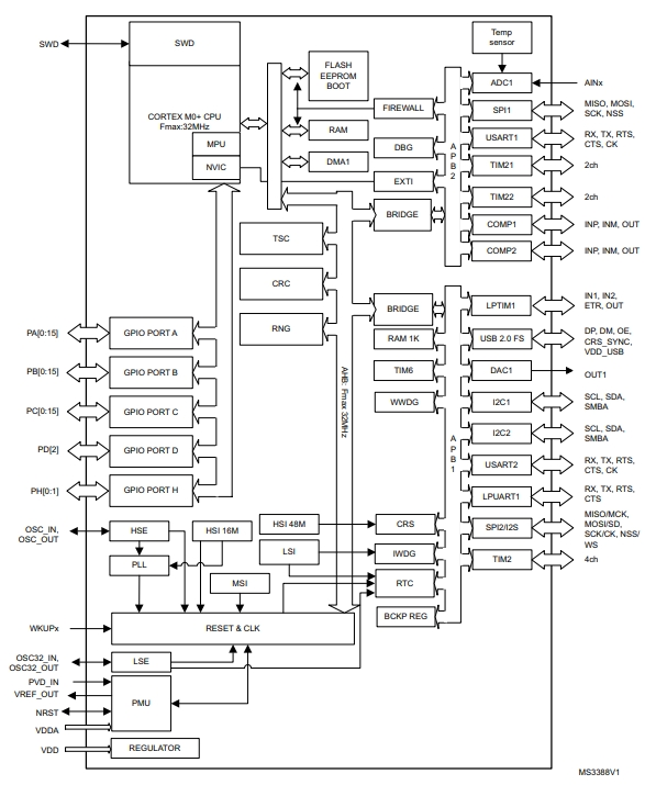 STM32L052T8Y6TR的功能方框圖