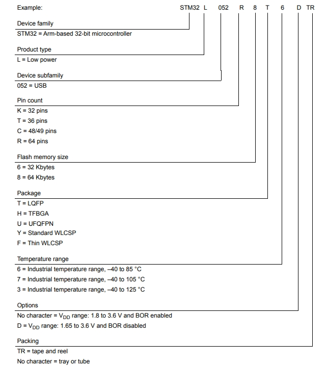 STM32L052T8Y6TR的型號解釋圖