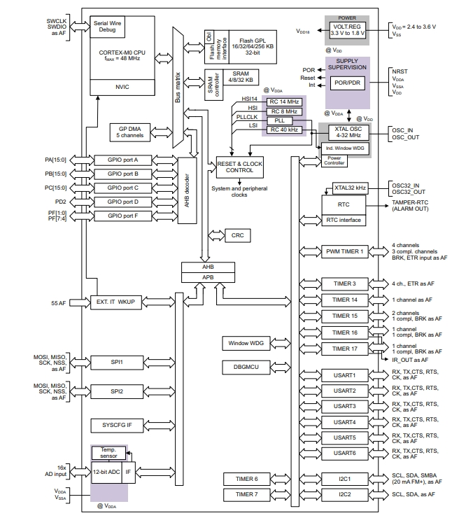 意法半導(dǎo)體STM32F030CCT6TR的功能方框圖