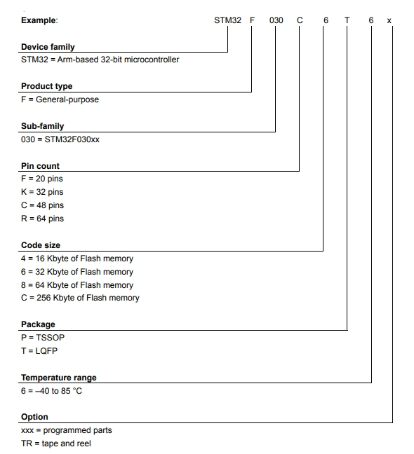 意法半導(dǎo)體STM32F030CCT6TR的型號(hào)解釋圖