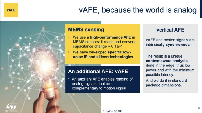 除了ISPU外,ST在此次傳感器峰會(huì)上還介紹了一個(gè)獨(dú)具特色的模塊——vAFE。該類(lèi)器件是在MEMS傳感器上增加了一個(gè)模擬前端,從而實(shí)現(xiàn)了機(jī)電感知+模擬感知技術(shù)的融合。Francesco表示,通過(guò)vAFE,客戶(hù)就能夠有效地連接到MEMS傳感器,從而能夠更好地使用其內(nèi)部的處理邏輯,能夠更好地嫁接和外部任何的模擬器件之間的聯(lián)系。