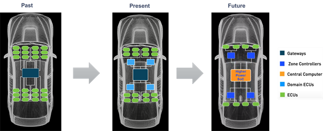 過去的汽車,幾十個電子控制單元(ECU)遍布車身用于處理本地數據。如今的汽車則由域控制器聚合并處理來自車身各個部分的數據。未來的車輛更將配備中央計算機,提供更高算力來支持高級駕駛輔助功能、高端信息娛樂系統、連接性以及其他先進的功能。