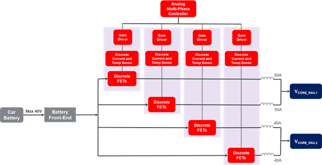 未來汽車的中央計算機將依靠功能強大的 SoC。這些 SoC 將具有先進的 CPU 和 GPU 功能,能夠處理海量的數據并執行復雜的計算,讓車輛能夠實時做出決策。這樣的SoC 需要先進的電源管理解決方案,尤其是核心電壓軌的電源解決方案。