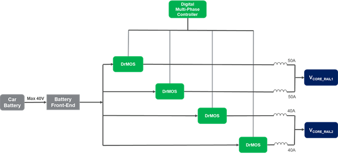 圖 6 展示了一個采用 22V 額定電壓 DrMOS 產品實現的單級功率轉換方案。配備12V鋰離子電池的汽車可以直接使用22V DrMOS,無需預調節器將電池電壓轉換為 SoC 核心軌電壓。這是實現最佳效率、更小PCB 面積、更低成本和更優電氣性能的理想解決方案。