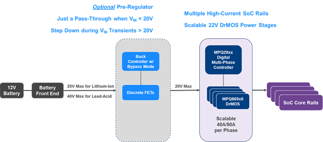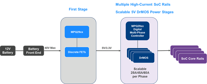 汽車 SoC 核心電源應用中使用的先進電源管理解決方案、數字多相控制器和 DrMOS 功率級必須是具備可擴展性、靈活性且緊湊的電源解決方案,同時還要具備高效率和快速瞬態響應。本文介紹了如何實現單級或兩級功率轉換的電源架構。要了解MPS 汽車 SoC 核心電源解決方案的更多信息,請查閱我們的 AEC-Q100 級多相數字控制器和DrMOS 功率級產品。