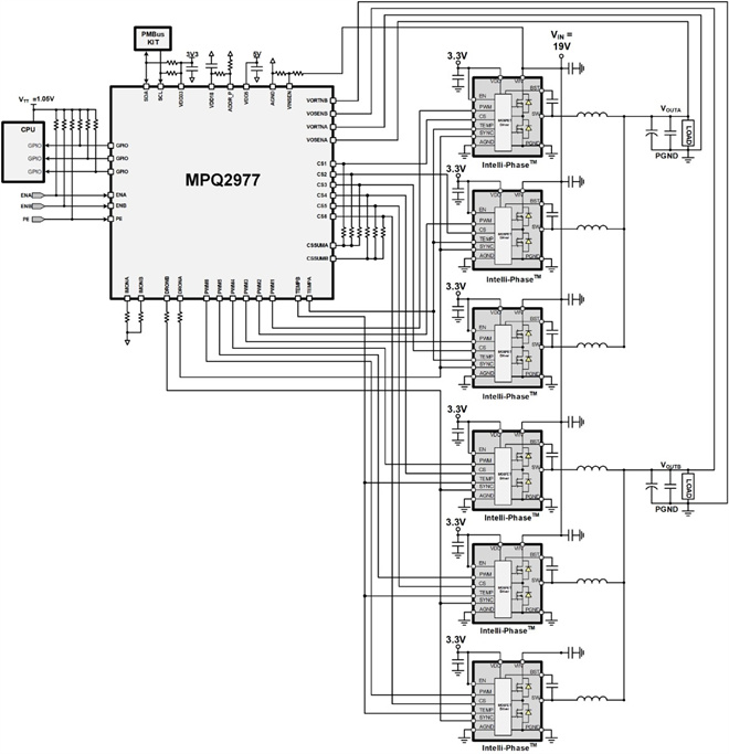 圖 8 顯示的簡化應用原理圖采用了MPS 的數字多相控制器和單片DrMOS功率級。MPQ2977-AEC1配置為兩個輸出軌,每個軌三相。這個全面的解決方案只需很少的外部組件,同時還提供多種監控和保護功能,例如過流保護 (OCP)、過壓保護 (OVP) 和過溫保護 (OTP)。