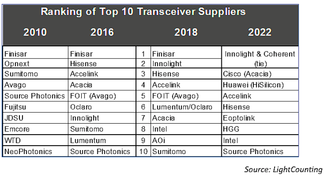 2022年,旭創(chuàng)科技(排名并列第1)、華為(排名第4)、光迅科技(排名第5)、海信寬帶(排名第6)、新易盛(排名第7)、華工正源(排名第8)、索爾思光電(排名第10)入圍。值得一提的是,索爾思光電被中國(guó)公司收購(gòu),故本期已是中國(guó)光模塊廠商。