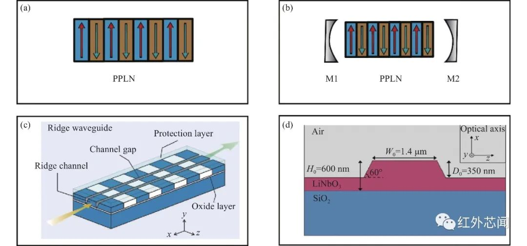 圖4 可用于實現頻譜遷移探測的不同光學結構。(a)體塊晶體;(b)諧振腔中的體塊晶體;(c)脊型波導結構;(d)納米鈮酸鋰薄膜波導