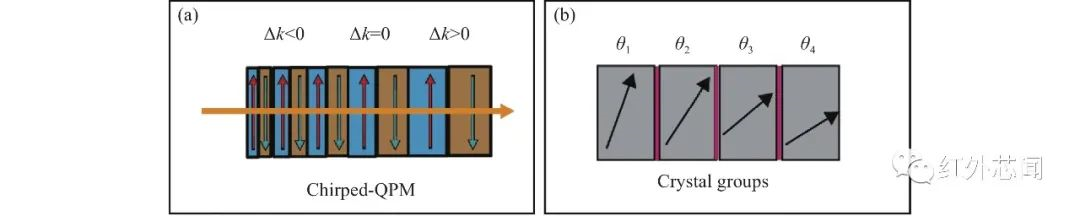 圖5 不同方式實現大接收帶寬頻譜遷移。(a)啁啾極化晶體;(b)多個不同切割角的晶體膠合在一起