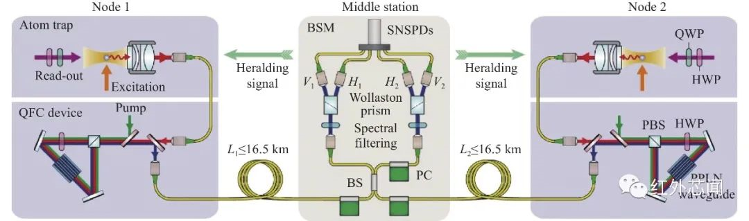 頻譜遷移探測在量子信息中的應用主要分為兩個方面:一方面頻譜遷移可以作為紅外單光子探測手段,早期主要用于解決近紅外波段尤其是通信波段缺乏高性能探測的問題,隨著超導探測器和銦鎵砷制冷探測器的性能水平提高,目前在通信波段頻譜遷移單光子點探測器的應用需求迫切程度在大幅度下降。但是在更長的中紅外波段,目前還缺乏有效的單光子探測器,頻譜遷移單光子探測是現階段的一種有效手段。丹麥科技大學研究組通過頻譜遷單光子探測實現了一對中紅外光子的符合測量。另一方面,用于量子信息技術研究的不同物理系統往往工作在不同的波長,為了實現量子態在不同物理體系間的傳遞和耦合需要彌補不同物理體系工作波長的差距,頻譜遷移具備改變量子態的波長而不改變所加載的量子態信息的特點,因此可以用于不同工作波長物理體系的量子態波長接口。在量子頻率接口方面,目前已實現了單光子量子比特、時間能量、偏振和軌道角動量糾纏態的量子波長接口。最近,德國H. Weinfurter組基于冷原子體系產生的光子結合高效率量子波長接口,實現了遠距離的量子糾纏交換(如圖7所示)。