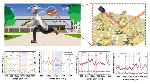 科研人員借助蘭州重離子研究裝置(HIRFL),通過在離子徑跡蝕刻聚碳酸酯(PC)膜上原位合成金納米星(AuNSs),制備了一種可穿戴納米多孔柔性SERS基底用于汗液富集和分析。由于基底具有納米多孔結構,能夠有效地快速收集分析物,在10-4到10-13M的分析物濃度范圍內表現出良好的信號重現性和均勻性,并可從收集的汗液中給出乳酸和尿酸等物質信息的變化。