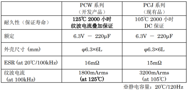 為了在高溫下也能保持穩定的特性,“PCW系列”采用了高耐熱性的密封橡膠,為了降低產品自我發熱,通過優化引線等構件實現了低 ESR。