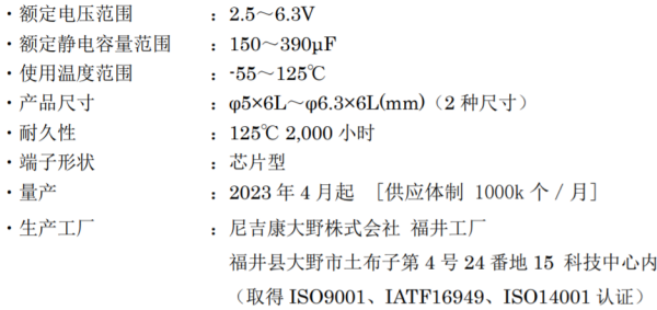 尼吉康株式會社向市場投放了在車載領域以及通信領域等要求很高的,高溫下實現了紋波電流疊加保證的“PCW系列”導電性高分子鋁固體電解電容器。導電性高分子鋁固體電解電容器的紋波電流疊加保證品屬于業界首創。