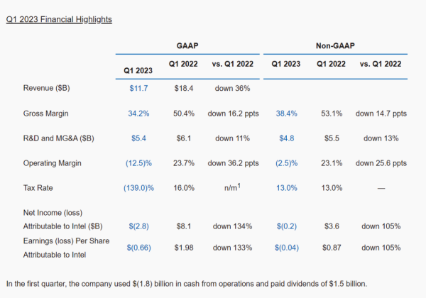 2023年第一季度,Intel總收入117億美元,同比下降36%,毛利率34.2%,同比下降16.2個百分點,凈虧損28億美元,創造歷史之最,而去年同期為凈利潤81億美元。