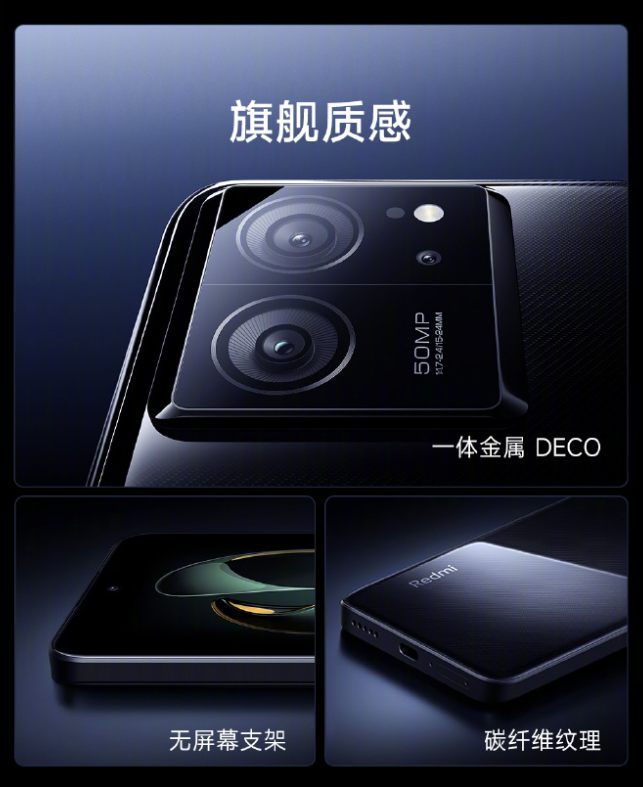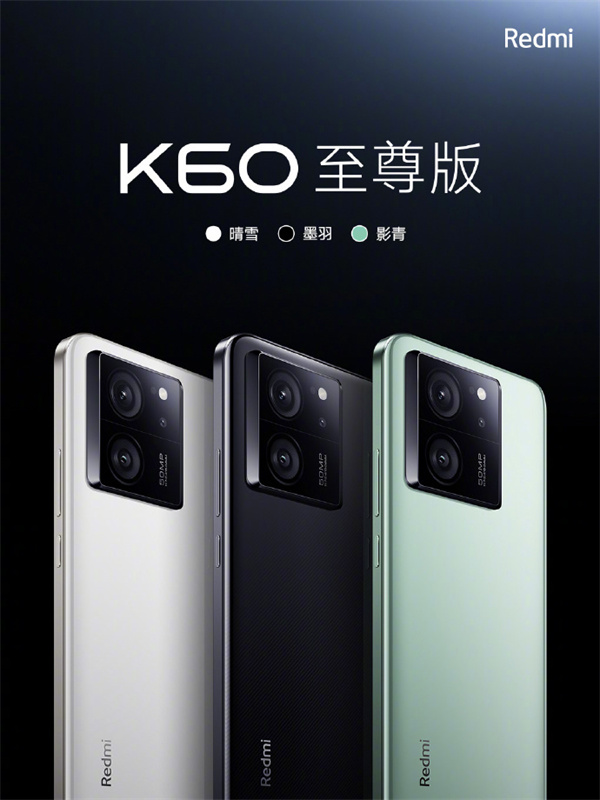 Redmi K60 至尊版擁有墨羽、影青、晴雪三款配色,厚 8.49mm,重 204g,采用一體式金屬 DECO、無屏幕支架,后蓋為碳纖維紋理。
