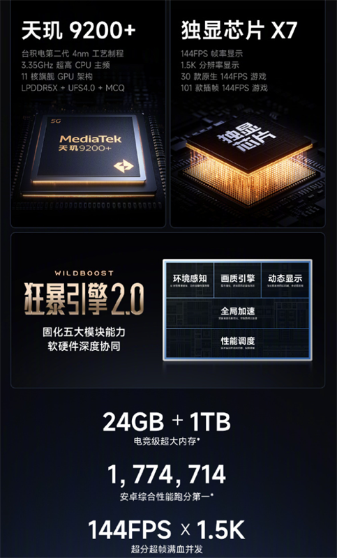Redmi K60 至尊版搭載聯發科天璣 9200+ 旗艦處理器,配有 Pixelworks 逐點的 X7 獨顯芯片,最高 24GB LPDDR5X 內存和 1TB UFS 4.0 閃存,還搭載了全新的狂暴引擎 2.0。