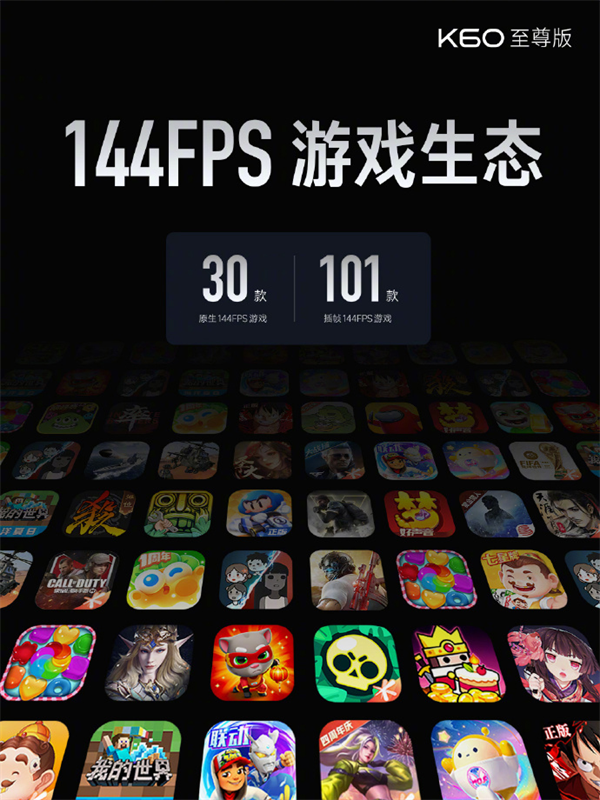 在游戲表現上,Redmi K60 至尊版支持了 100 + 款 144FPS 插幀游戲,以及 30 款原生 144FPS 游戲。