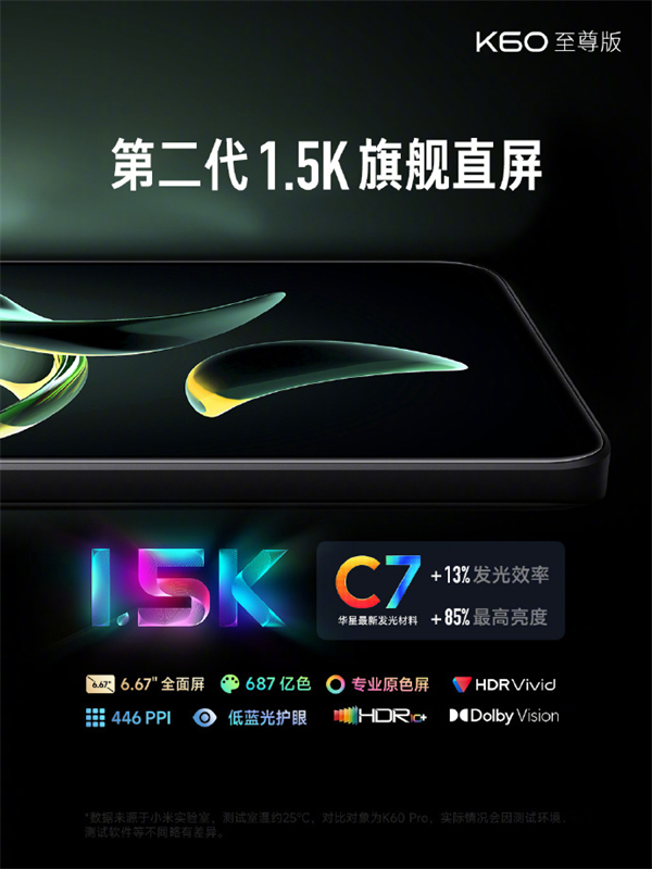 該機采用一塊 6.67 英寸 2712×1220 華星光電 C7 OLED 直屏,峰值激發亮度 2600nit,支持 144Hz 刷新率,2880Hz 高頻 PWM 調光;擁有 5000mAh 電池,120W 快充,號稱“19 分鐘充電 100%”。