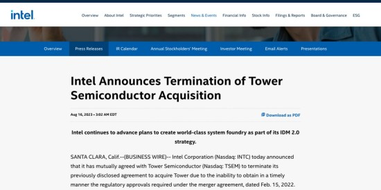 北京時間8月16日下午,芯片巨頭英特爾(Intel,NASDAQ:INTC)宣布,由于無法獲得以色列芯片制造公司高塔半導體(Tower Semiconductor,NASDAQ:TSEM)公司的股份,其已與高塔半導體雙方達成一致,終止之前2022年2月披露的收購協議。