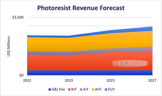 電子材料市場研究機構TECHCET最新數據顯示,光刻膠市場預計將在2024年反彈,同比增長7%,市場規模達到25.7億美元;2022-2027年間復合年增長率為4.1%。