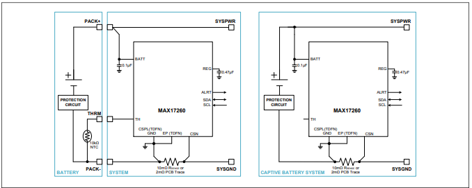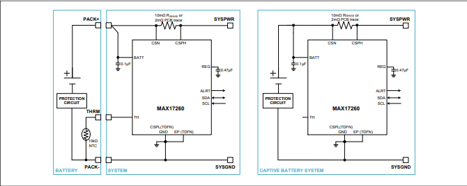 MAX17260為超低功耗電量計IC,采用Maxim ModelGauge? m5算法。IC監測單節電池,支持高邊和低邊電流檢測。
