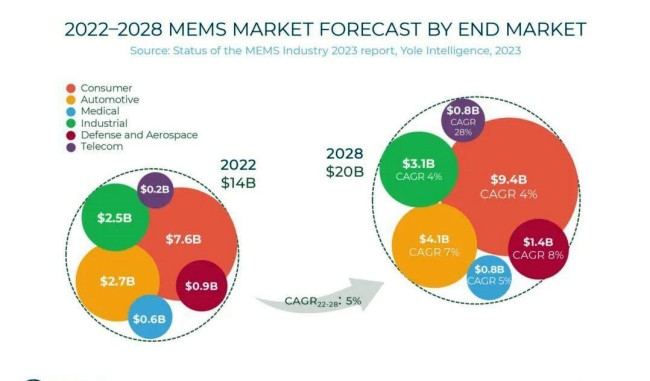 根據Yole Group發(fā)布的MEMS年度報告《Status of the MEMS Industry 2023》,MEMS市場將以5%的年復合增長率,從2022年的145億美元增長到2028年的200億美元。消費型仍然是MEMS市場中最大的細分領域,在這一細分市場中,新興的可穿戴應用將抵消最近智能手機需求量的下滑,以4%的年復合增長率從76億美元增長到94億美元。汽車產業(yè)繼續(xù)從日益增加的車內自動駕駛功能中獲益,并將保持第二大市場的地位——而工業(yè)、醫(yī)療和電信等市場在預測期的年復合增長率至少為5%。