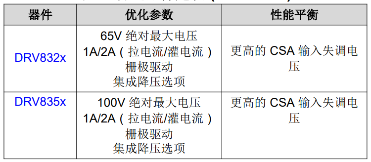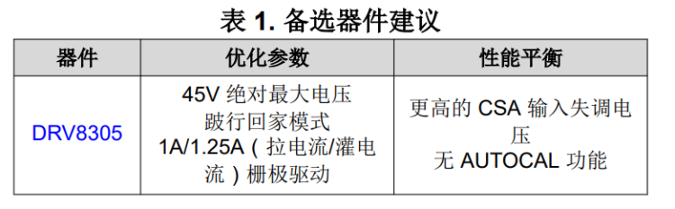 備選器件建議 根據必要的系統要求,還可通過其他器件提供所需的性 能和功能。對于需要詳細診斷和跛行回家模式支持的應 用,建議使用 DRV8305。在需要更高工作電壓(例如 由 36V 電池供電)的應用中,宜選擇 DRV832x。