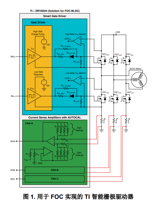 三相 BLDC 電機需要一個三相電壓源逆變器 (VSI) 為 電機提供交流電流。該 VSI 的開關通常采用由柵極驅 動器驅動、適用于低壓應用的場效應晶體管 (FET),或適用于高功率應用的絕緣柵雙極晶體管 (IGBT)。當今 大多數可用的柵極驅動器都需要使用外部柵極元件(電 阻和齊納二極管)來進行操作和提供保護。但是,采用 TI 的智能柵極驅動 (SGD) 技術后則無需使用外部柵極 原件,如圖 1 中所示。借助其可調節柵極驅動電流 (柵極壓擺率控制),SGD 架構可靈活地減少電磁干 擾 (EMI)。SGD 架構可優化死區時間,提高效率,同時充分保護 FET 免遭擊穿,還添加了強下拉電流來防 止任何雜散 dv/dt 柵極導通。